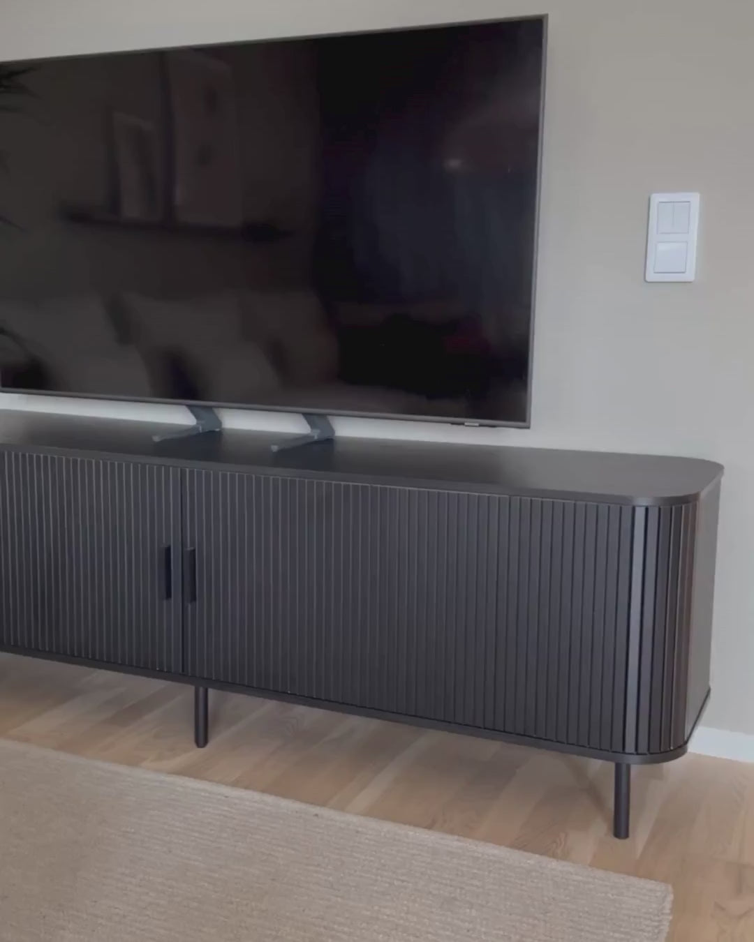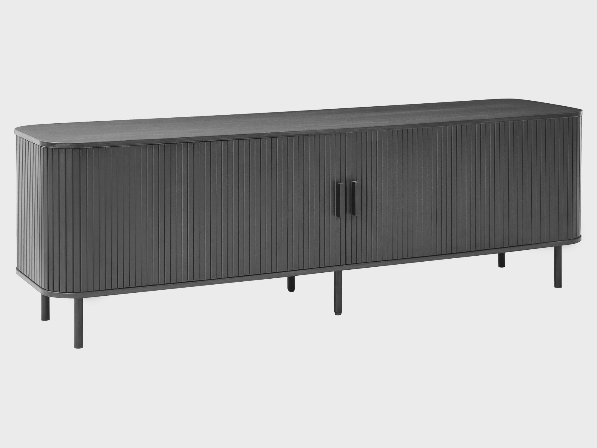 BRADLEY テレビボード(ブラック)は、レトロなデザインと現代的な収納機能を融合したTVスタンドです。スタイリッシュなルーバー引き戸を採用し、内部には4段の収納棚を備えているため、AV機器やメディアアクセサリーをすっきりと収納できます。